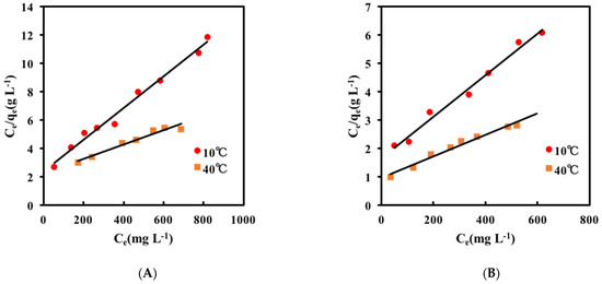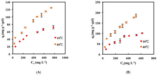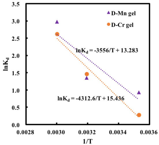 Figure 3 shows the isotherms of As(III) adsorption by D-Mn and D-Cr gels at 10 °C and 40 °C, respectively, for 24 h (24 h is enough to ensure that the adsorption can reach an equilibrium state). The maximum amount of As adsorbed in the gel increased with the increasing temperature, as did the amount of As adsorbed in general. This enhancement in the adsorption process could be attributed to the progress of the redox reaction facilitated by the increase in temperature. The maximum adsorbed amount in the gel and the equilibrium adsorption constant could be calculated from the slope of the straight line and the intercept, respectively, according to the Langmuir isotherm adsorption Formula (2), as shown in Figure 4A,B.