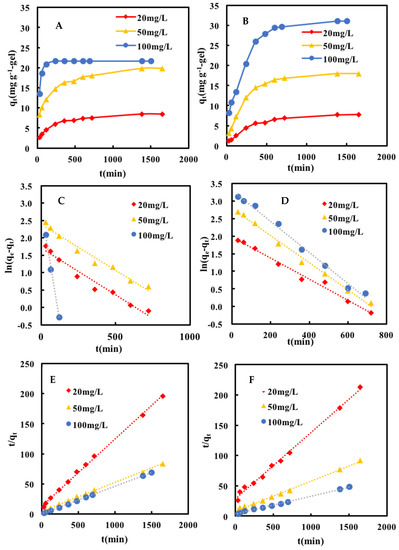 Adsorption kinetics of (A) D-Mn and (B) D-Cr gels; plots of the pseudo-first-order dynamic model of (C) D-Mn and (D) D-Cr gels; plots of the pseudo-second-order dynamic model of (E) D-Mn and (F) D-Cr gels.