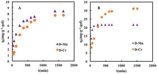 Comparison of the adsorption kinetics of the D-Mn and D-Cr gels at the initial As(III) concentration of (A) 20 mg L−1 and (B) 100 mg L−1, respectively.