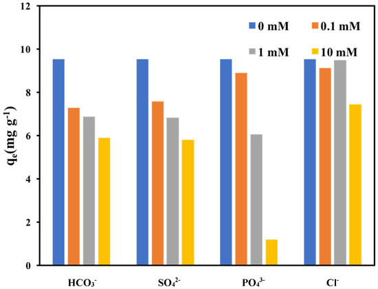 In wastewater treatment, various anions like HCO3−, SO42−, PO43−, and Cl− are present in aqueous solutions. To determine the effect of the coexistence of other anions on the As adsorption, a coexisting ion adsorption experiment was conducted at an initial As(III) concentration of 20 mg L−1.