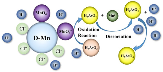 In addition, it was confirmed that the removal rate increased remarkably with the increasing pH, becoming nearly constant for pH > 3. However, when pH < 2, the As removal rate decreased significantly. This phenomenon could be attributed to two reasons: (1) large amounts of Cl− ions derived from the HCl were used to adjust the pH, suppressing the formation of the oxidation product As(V) on the gel, as shown in Scheme 1; (2) when a large amount of H+ ions suppressed the dissociation of H3AsO4 and H3AsO3, the exchange of Cl− and As (III) and As (V) was inhibited, thereby reducing the adsorption removal rate, as shown in Scheme 2.