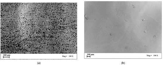 A porous surface was obtained only in the case of the 1 wt% agarose-based cryogels (Figure 1a). At the larger polymer concentration (8 wt%), the surface of the samples was smooth and completely closed (Figure 1b). This result can be due to the increase in polymer concentration, which determined a major resistance to pore growth up to the sample surface.