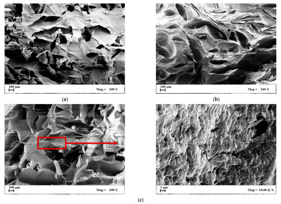 Considering the morphology of the biopolymeric structures obtained at all of the investigated agarose concentrations shown in Figure 3, a competition between the nucleation rate of ice crystals and the rate of crystal growth can be hypothesized. In particular, the cross-sections reported in Figure 3 reveal a dense microstructure with randomly distributed irregular pores that could be due to a multiple orientation of crystal growth during freeze-drying. The nanofibrous structure observed in the samples of Figure 2 was not present in the cryogels produced using a slow cooling rate, and only a sort of rugosity appeared in some points of the cryogels section (see detail in Figure 3c).