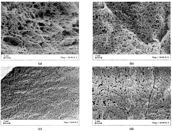 SEM images of aerogels section: (a) 1 wt% agarose; (b) 3 wt% agarose; (c) 5 wt% agarose; (d) 8 wt% agarose.