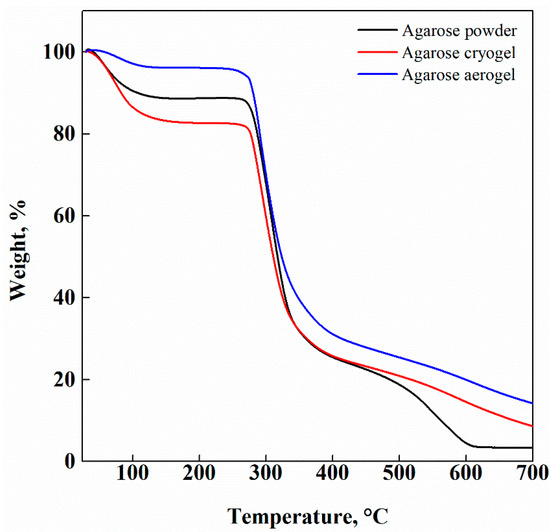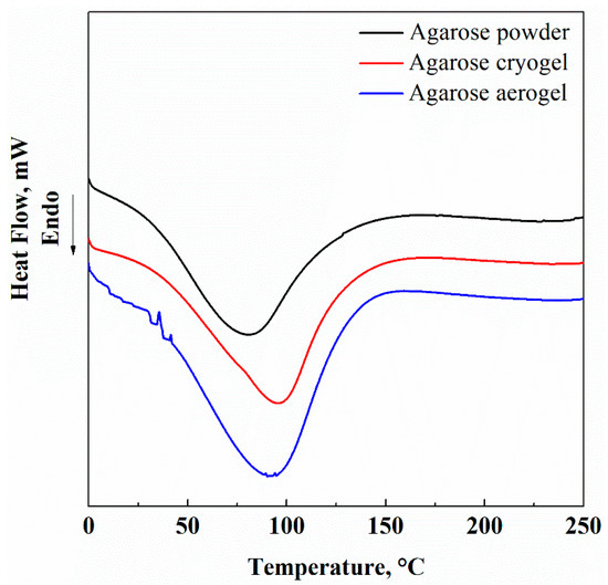 Thermograms of pure agarose, agarose-based cryogels and agarose-based aerogels are illustrated in Figure 6. This analysis was carried out to verify if the different processes influenced the thermal behavior of the porous agarose-based structures.