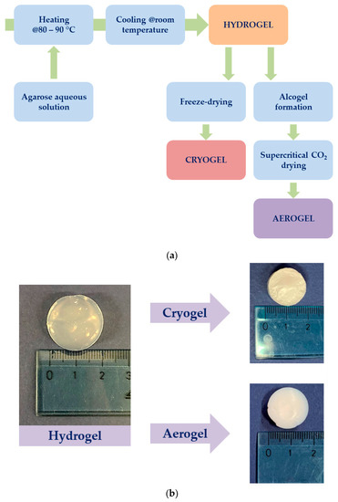 A schematic representation of the main steps involved in agarose cryogels and aerogels preparation is reported in Figure 8a; whereas Figure 8b shows the samples obtained.