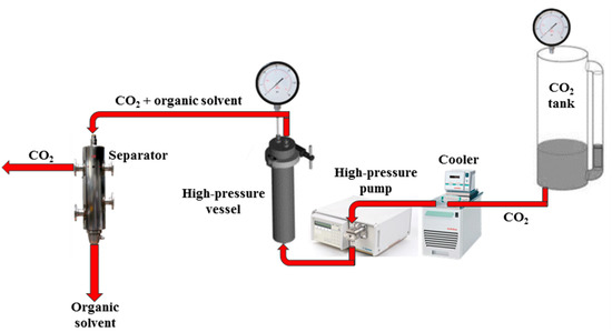 The drying process was performed in a laboratory apparatus, shown in Figure 9, equipped with a 316 stainless steel high-pressure vessel with an internal volume of 200 mL. The alcogels were placed in the vessel, which was closed and filled from the bottom with SC-CO2 up to the desired pressure using a high-pressure pump (Gilson, mod. 305, Middleton, WI, USA). The apparatus operated in a continuous mode for 5 h. At the end, the vessel was slowly depressurized for 1 h. More details about the plant layout can be found in [55,56].