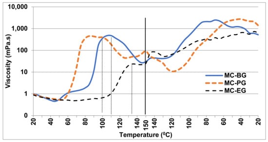 Viscosity curves for MC in ethylene glycol (EG), propylene glycol (PG) and butylene glycol (BG).