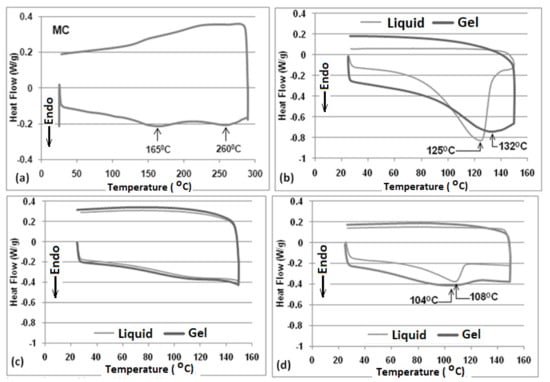 DSC results show two broad peaks for MC (Figure 2a). The peak at lower temperature (165 °C) could be a result of the breaking of some of the intermolecular hydrogen bonds. The peak near 260 °C represents the melting of MC, and this confirms the previous findings using hot stage microscopy, which showed the complete disappearance of the crystalline structure of MC near 268 °C [23]. The breaking of intermolecular and intramolecular hydrogen bonds caused by MC dissolution in EG (liquid) causes the heat absorbance as indicated via the endotherm in Figure 2b. No transition was observed during cooling, indicating that the formation of a network structure (i.e., gel) by MC in EG results in a less-ordered structure. For the gel state of MC in EG (i.e., after heating), a broadened endotherm was observed due to the melting of a relatively less ordered structure. For MC in PG, no identifiable peaks were observed, and for both liquid and gel samples, similar DSC curves were observed (Figure 2c). Similar results have been previously obtained for gels of MC in other solvents wherein no peaks were identified during cooling [24,25]. This is attributed to the fact that the gel-to-solution transformation is caused due to intermolecular H-bonding, whereas the solution-to-gel transformation is caused due to both intermolecular and intramolecular hydrogen bonding. Moreover, the enthalpies were much lower compared with other samples (Table 1). This could be attributed to the better dissolution of MC in PG. Because of their likeness, the solvency of PG for MC is high, and the heat flow results are relatively low compared to the other two glycols. For MC in BG, the DSC curves (Figure 2d) also suggest that, upon heating, MC structure breaks (melts) and a relatively sharp endotherm is obtained. For gel state of MC in BG, a wide endotherm was obtained upon heating which could be attributed to the melting of a less ordered/imperfect crystalline structure.