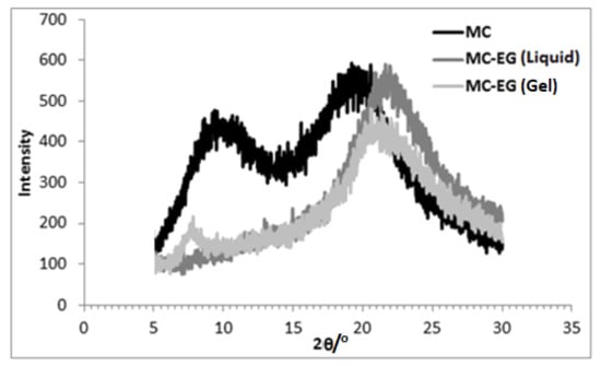 The presence of some crystalline order is evident in MC powder with two broad peaks near 2θ~9° and 19° as shown in Figure 3. For liquid MC in EG, the peak at 2θ~8° vanished, and the peak at 2θ~19° increased to 2θ~22°. For the MC in EG (gel) sample, the XRD pattern showed a low intensity and a sharp peak at 2θ~8°, and the peak intensity at 2θ~22° was reduced as indicated in Figure 3.