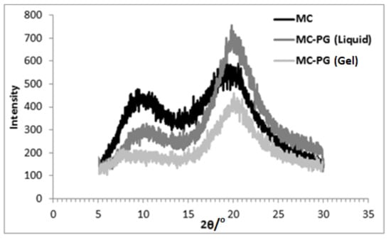For MC in PG (liquid), the peak near 2θ~9° moved to 2θ~10°. An intense and sharp peak appeared near 2θ~21° (Figure 4). When the sample was heated and cooled (gel), the peak at 2θ~10° almost disappeared, whereas the peak intensity at 2θ~21° was reduced significantly.