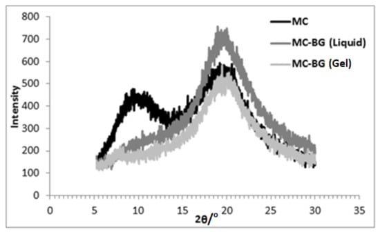 For MC in BG (liquid), the peak near 2θ~9° vanished, and the second peak was observed at 2θ~19.5°, as shown in Figure 5. A shoulder near 2θ~7° and reduced peak intensity near 2θ~19.5° was observed for the MC in BG (gel) sample.