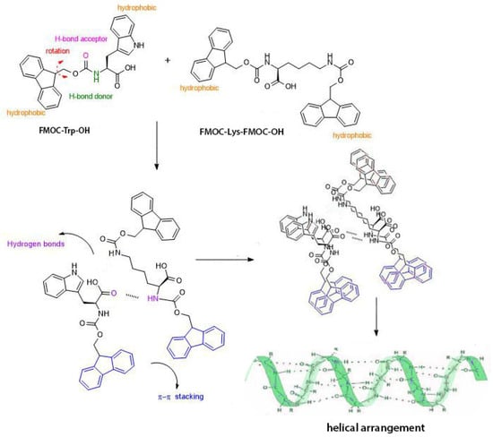 Generally, the short peptides and amino acids are modified at the N–terminal with a voluminous aromatic group, such as 9–fluorenylmethyloxycarbonyl (FMOC), naphthalene, anthracene, carbazole or tert–butoxycarbonyl (BOC). The FMOC group is offering a base-sensitive protection group, while its aromatic rings have remarkable physicochemical properties in the formation of organized structures through π–π stacking [].