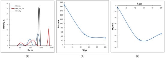(a) Particle size distribution of FMOC_Lys/FMOC_Trp = 1/1 sample compared to FMOC–Lys–FMOC–OH and FMOC_Trp–OH; (b) hydrodynamic diameter (DH), (c) zeta potential (ZP) as function of the lysine amount.