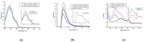 In Figure 4a are reported the UV-Vis spectroscopic results for FMOC–Trp_FMOC–Lys–FMOC: 1/3, FMOC–Trp_FMOC–Lys–FMOC: 1/1 and FMOC–Trp_FMOC–Lys–FMOC: 3/1 co-assembled hydrogels, respectively the simple hydrogels like FMOC–Trp–OH and FMOC–Lys–FMOC–OH (Figure 4—inset). The UV-Vis absorbance spectra of co-assembled hydrogels showed a dominant peak at 265 nm with two shoulders at 288 and 300 nm. According to the study realized by S. Prasad et al. [], the absorption features seen around the 255–280 nm region are assigned to chromophores present in the side chains of the aromatic amino acids. In the case of Trp, the indole ring is considered the mainly source of UV absorbance and emission and increased the intensity of the adsorption bands [,]. Thus, FMOC–Trp–OH and FMOC–Trp_FMOC–Lys–FMOC:3/1 present a higher intensity of the absorption bands comparative to the other sample where the amount of FMOC–Trp–OH decreases.