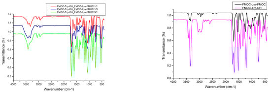 Specific stretching vibrations of the C=O from the carboxyl group is present at 1700–1690 cm−1 and provide the information on the formation of the hydrogen bonds. Therefore, the movement of the absorption bands from 1695 cm−1 (for FMOC–Trp_FMOC–Lys–FMOC: 1/3) to 1705 cm−1 (for FMOC–Trp_FMOC–Lys–FMOC: 3/1) indicates that a higher amount of FMOC–Lys–FMOC leads to the involvement of a higher amount of the carboxyl groups in the formation of intra and intermolecular hydrogen bonds.