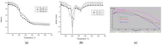 TG (a), DTG (b) and inflection point (Tg) from DTA curves of amino acids-based lyophilized gels. (c) DTA curves.