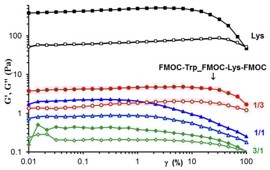 Figure 7 presents the viscoelastic moduli, G′ and G′′, determined as a function of deformation (γ) in amplitude sweep tests at constant oscillation frequency (ω) of 1 rad/s. All samples, Lys and FMOC–Trp_FMOC–Lys–FMOC of different compositions present gel-like behavior with G′ > G′′. The linear range of viscoelasticity is influenced by the sample composition, being extended for the Lys sample and FMOC–Trp_FMOC–Lys–FMOC in 1/3 ratio, when the nonlinear behavior starts for γ > 10%. For FMOC–Trp_FMOC–Lys–FMOC in 1/1 and 3/1 ratios, the linear behavior is observed below γ = 1%.