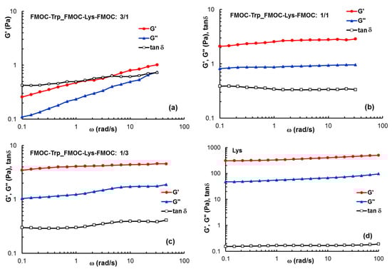 The dependences of G’, G”and tan δ as a function of the oscillation frequency at 25 °C and γ = 1% for the investigated gel samples: (a) FMOC–Trp_FMOC–Lys–FMOC: 3/1; (b) FMOC–Trp_FMOC–Lys–FMOC: 1/1; (c) FMOC–Trp_FMOC–Lys–FMOC: 1/3; (d) Lys.