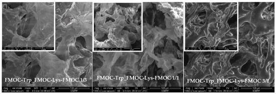 Hydrogels are three-dimensional networks with substantial water content. The integrity of the hydrogel changes with the removal of water from the system. The morphological characterization of hydrogels by SEM analysis provides essential information on the size, shape and distribution of pores in their three-dimensional matrix []. The capacity of water absorption and the swelling kinetics of the hydrogel depend directly on the pore architecture, the presence of hydrophilic functional groups and the elasticity of the network. [] Thus, a network with regular distributed pores which have tunable shape and dimension will allow a better attachment of cells, with good application in 3D cell culture. As seen in the SEM images (Figure 9), the co-assembled gels have a homogeneous structure with interconnected pores. The fragile structure and smooth surface of gels are independent on the ratio between the compounds. However, the increase of FMOC–Trp–OH content in the hydrogel composition leads to a denser and less homogeneous structure.