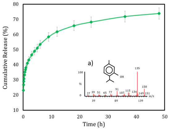 In vitro release profile obtained for the chitosan-thyme nanocapsules, (a) mass spectrum of thymol found in thyme essential oil (majority compound in the sample).