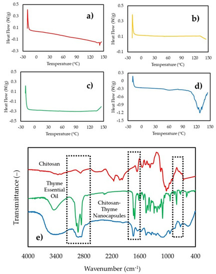 Differential scanning calorimetry for the components of the nanocapsules (a) chitosan, (b) TPP, (c) thyme essential oil, and (d) chitosan-thyme nanocapsules, and (e) infrared spectra of the chitosan nanocapsules obtained by ionic gelation and its components.