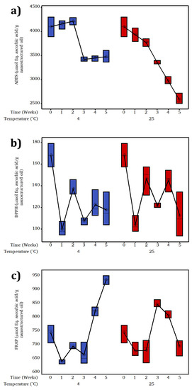 The TEO concentration is shown in Table 3; the ANOVA evidences a statistically significant effect of storage time and temperature (p ≤ 0.05). A significant decrease occurred in the samples stored at 25 °C in the first week of storage, as they presented losses of the active agent of approximately 20%. This can be explained by the fact that the terpenes of the essential oils are volatile compounds, so the effect of temperature was a determining factor in their residual concentration [8]. Stabilization of the thyme essential oil concentration occurred in storage at 4 °C (~75%) from week 2 until the end of storage, in contrast to the result of ~60% obtained at 25 °C. Numerous studies mention the effect of temperature on thermolabile compounds during storage. However, the polymer structure affects the properties of bioactive agents including the antioxidant capacity discussed below.