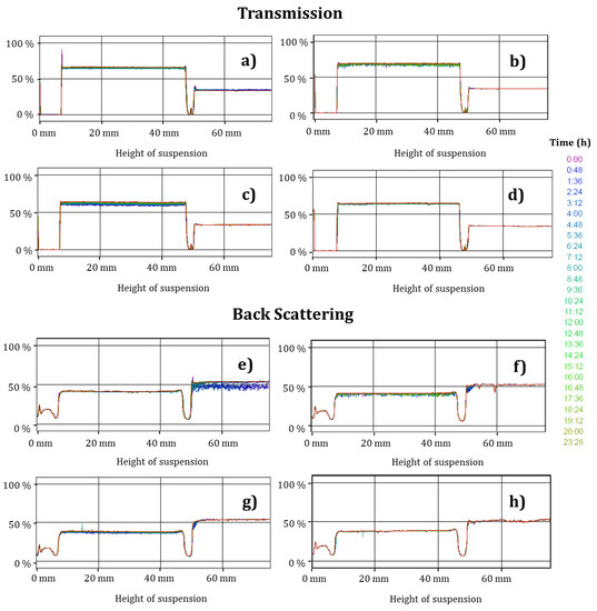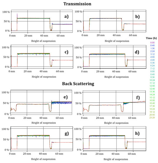 Transmission and backscatter profiles of nanocapsules stored at 25 °C. (a,e) initial, (b,f) week 1, (c,g) week 3 (d,h) week 5.