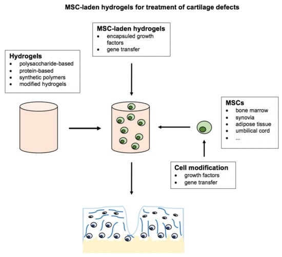 Hyaline cartilage is a highly specialized and complex tissue and with limited regenerative potential. Although cell-based methods have emerged as a successful treatment option for OA and cartilage defects major obstacles, such as loss of transplanted cells, adequate chondrogenic differentiation, and phenotype maintenance, as well as chondrogenic hypertrophy and osteogenic de-differentiation or integration difficulties, remain [,]. To further optimize TE approaches for cartilage repair, research has focused on different combinations of scaffolds, MSC-subpopulations, and growth factors. This review focused on the use of MSC-laden hydrogels and possible modifications using growth factors or gene transfer for use in cartilage engineering.