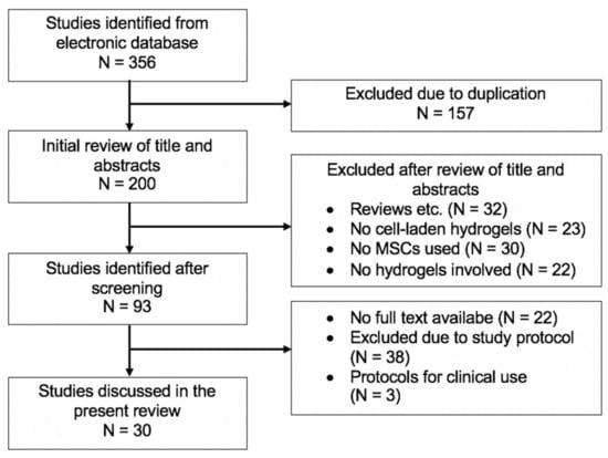 The results of our literature research are pictured in Figure 3. The described search string led to 357 initial articles. After excluding duplicates, 200 papers remained. Following this procedure, we performed a manual review based on displayed study titles and abstracts which was performed by three independent reviewers. We found that 32 articles represented reviews or presentations, and 45 studies did not cover the use of cell and cell-laden hydrogels for the treatment of cartilage defects. After a full review, out of the consisting articles, 30 papers did not relate to MSCs resulting in a total of 93 studies after screening.