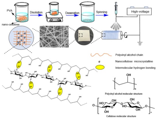 - Sanders, J.E.; Han, Y.; Rushing, T.S.; Gardner, D.J. Electrospinning of Cellulose Nanocrystal-Filled Poly (Vinyl Alcohol) Solutions: Material Property Assessment. Nanomaterials 2019, 9, 805. [Google Scholar] [CrossRef] [Green Version]