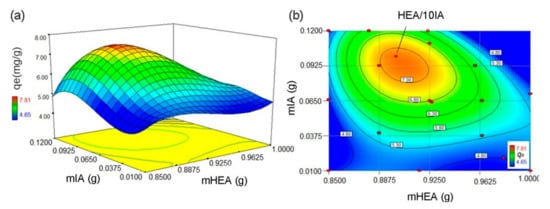 The optimization of hydrogel synthesis was performed in order to produce adsorbents with good swelling properties and removal abilities for Ni2+ ions. The results of the optimization of adsorbent synthesis, conducted based on the experimental plan, are shown in Supplementary Materials (Table S1). The estimated surface Figure 1a and contour Figure 1b plots based on qe (mg/g) for Ni2+ ions are presented in Figure 1. The x and y axes show the two input parameters for hydrogel synthesis, which have the greatest influence on the adsorption properties of the hydrogel, mass of 2-hydroxyethyl acrylate (HEA) and itaconic acid (IA). The third axis represents the response–adsorption capacity of the hydrogel towards Ni2+ ions, which depends on the composition of the hydrogel itself. As presented in Figure 1, Figures S1−S5 and Table S1, the maximum adsorption capacity for Ni2+ ions was achieved for hydrogel prepared by using 10 mass % of IA. In this paper, this sample was coded as HEA/10IA hydrogel. According to this result, all further experiments were performed with HEA/10IA hydrogel. Additionally, the interactions between process variables and responses were determined by analysis of variance (ANOVA), and the results are provided in Supplementary Materials (Table S2).