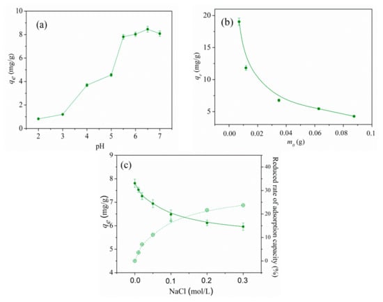 Figure 2b represents the influence of adsorbent mass on the adsorption capacity of nickel ions. When adsorbent mass increased, adsorption capacity significantly decreased, which can be explained by the fact that nickel ions on the surface of the adsorbent and nickel ions in the solution reached a balance []. The influence of ionic strength on adsorption was also studied since different salts are very often found in water. The experiments were conducted with different concentrations of NaCl. It was found that the increase in ionic strength results in a decrease in the adsorption capacity of hydrogels (Figure 2c). It can be concluded that the increase in salt concentration in the solution blinds the electrostatic interactions of the carboxylic groups of itaconic acid, which results in a reduction in polymer chains [,].