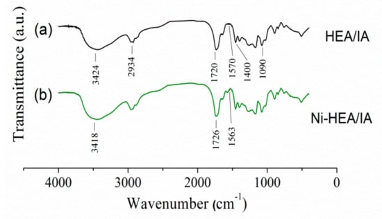 (a) FTIR spectra of the HEA/10IA hydrogel before (a) and after (b) Ni2+ ion adsorption.