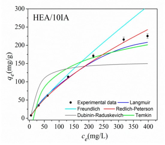 The adsorption isotherms of Ni2+ onto HEA/10IA hydrogel, as the dependence of qe on the equilibrium nickel concentration ce, are presented in Figure 6. All experimental data were fitted with five isotherms (Langmuir, Freundlich, Redlich–Peterson, Temkin and Dubinin–Radushkevich) by using commercial software OriginPro 8.5. The applicability of the isotherm models for describing the adsorption process was judged by a correlation coefficient, (R2) and chi-square analysis (χ2). The obtained characteristic parameters of the evaluated isotherm models are summarized in Table 1.