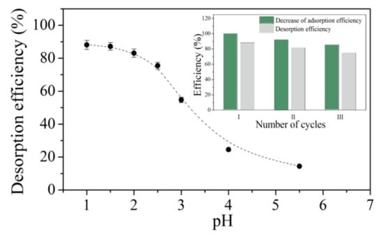 To examine the influence of pH of the desorption solution, experiments were conducted with different concentrations of HNO3, and the results are presented in Figure 7. The efficiency of desorption decreased with the increase in pH of the desorbing solution.