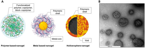 Drug delivery systems (DDSs are platforms that protect loaded active ingredients from degradation due to physiological conditions, as well as allowing the payloads to perform their desired activities at the target sites. Furthermore, some chemicals and biological drugs are cytotoxic to some extent, which is referred to as an undesired off-target effect. DDSs, such as inorganic nanotubes [1], liposomes [2], and inorganic [3] or polymeric nanoparticles [4], have been developed to overcome these disadvantages. A polymeric nanogel is classified as containing small nanoparticles (ca. 20–200 nm) that is fabricated using hydrophilic polymers as the main component. The crosslinked networks of the polymeric chains encapsulate and enhance the colloidal stability of the loaded molecules, and the hydrophilicity of the polymers entraps large amounts of water, which facilitate the diffusion and mass-exchange with physiological milieu, resulting in a controlled or sustained release of the payload.
