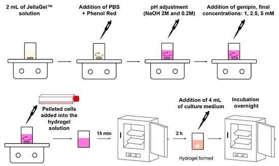 Graphical representation of the hydrogel preparation procedure: the different phases needed for preparing the hydrogels starting from JellaGel™ solution and the key parameters for each step are depicted.