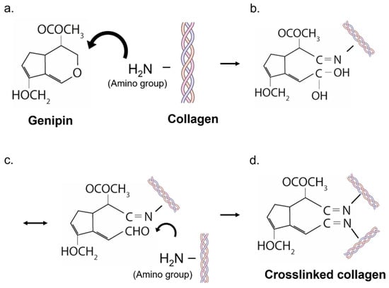 Schematic representation of the crosslinking mechanism of genipin. (a) genipin interaction with primary amine groups; (b) ring-opening reaction in genipin and covalent bond with the amino group of collagen; (c) formation of an unstable intermediate aldehyde group; (d) formation of a new covalent bond with another polimer, which leads to the formation of the crosslink.