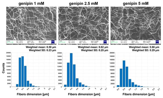 SEM images of JellaGel™ hydrogels crosslinked with genipin at different concentrations. The images are reported at a magnification of 1600×. They show the internal gel microarchitecture with the domains created by the collagen network. For each concentration, a histogram showing the diameter of the collagen fibers is also reported, highlighting the weighted mean and standard deviation for each concentration. Scale bars = 20 µm.