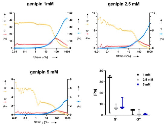Results of rheometric measurements. Representative graphs of the trend of storage modulus (G’), loss modulus (G”), and shear stress (τ) versus the shear strain (γ) are reported for each genipin concentration. Boxplots with G’ and G” values, calculated in the linear region of the curves, are also reported for all samples at the three genipin concentrations.