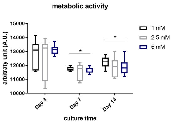 After 3 days, no significant differences were found among the three concentrations. The metabolic activity of the cells embedded within the hydrogels crosslinked with 1 mM genipin was significantly (even if slightly) higher than the one observed in the hydrogels crosslinked using 5 mM genipin both at day 7 (p = 0.02) and day 14 (p = 0.04).