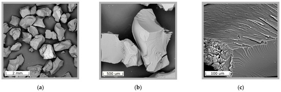 The results of microscopic studies of the RFR 3-1 sorbent are presented in Figure 1. The ion-exchanger surface is monolithic and does not contain cavities or channels. In the process of grinding the solid ion-exchanger, it cracks into irregularly shaped fragments with characteristic faces. The images obtained for RFR 1-1 and RFR 2-1 are the same as for RFR 3-1 and, therefore, are not shown here.
