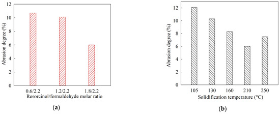 Mechanical strength of dry resorcinol-formaldehyde resins: (a) RFR abrasion strength versus resorcinol/formaldehyde molar ratio, (b) RFR abrasion strength versus solidification temperature (RFR sample 3-1).