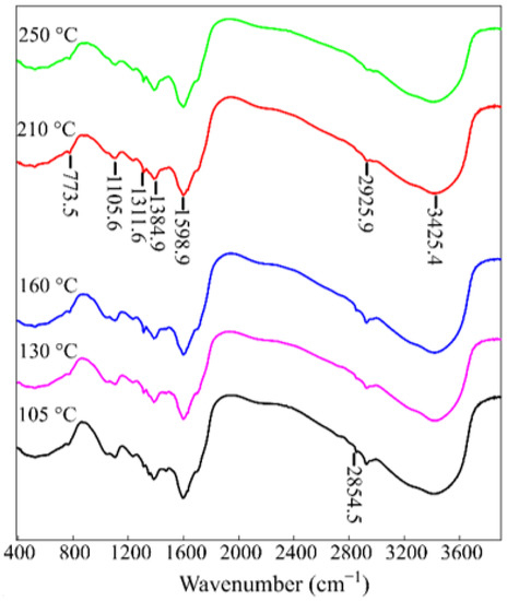 Figure 5 shows the IR spectra of the RFR 3-1 samples solidified at various temperatures and containing all the characteristic bands described earlier [21]. In particular, the bands in the range 3700–3300 cm−1 correspond to the intra- and intermolecular N-bonds in dimers and polymers. The bands in the range 3200–2800 cm−1 correspond to weak (average) stretching vibrations of C-H bonds in the aromatic components, 1608–1400 cm−1 correspond to stretching vibrations of the aromatic ring in arenas and acid with H- bonds (formic acid), 1295–1005 cm−1 correspond to plane bending vibrations of 1,2-, 1,4-, and 1,2,4-substituted C-H bonds, 1440–1300 cm−1 correspond to bending vibrations of OH- groups, 1000–550 cm−1 correspond to out-of-plane bending vibrations of C-H bonds in arenes, vibrations of hydroxyl groups, and C-O bonds in carboxylic acids. A distinctive feature for the RFR samples heated at 105, 130, and 150 °C is a band in the vibration range 2400–2000 cm−1 corresponding to the bound OH group and stretching vibrations of C-H in carboxylic acids. This fact confirms the presence of a certain number of methylol groups, which indicates incomplete crosslinking of the polymer. The oxidation of such methylol groups to carboxyl groups can occur with the rupture of bridging –CH2-groups, which also leads to the destruction of the polymer [22].