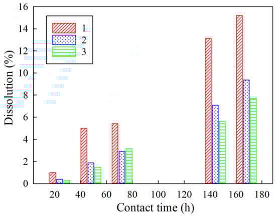 Dependence of the dissolution rate of the RFR samples on the time of contact with the model solution No. 2 (see Table 5). 1– RFR 1-1, 2–RFR 2-1, 3–RFR 3-1.