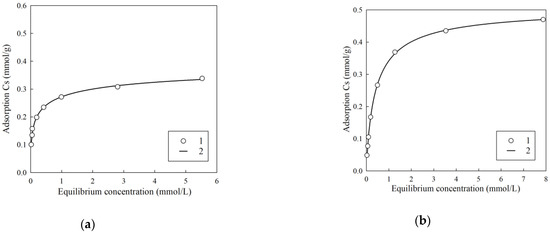 Isotherms of cesium sorption using RFR 3-1. (a) Model solution No. 1, (b) model solution No. 2. 1—experimental values; 2—approximation of experimental values by the SIPS equation.