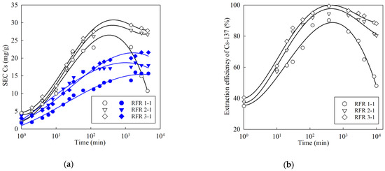 Kinetic curves of cesium adsorption: (a) extraction of stable isotope Cs (initial concentration 50 mg/L), (b) extraction of micro-concentration of radionuclide Cs-137, initial activity 1000 Bq/mL, open symbols—solution composition: NaNO3-2.25 mol/L, NaOH-0.75 mol/L; filled symbols— solution composition: NaOH–10–4 mol/L (pH 9).