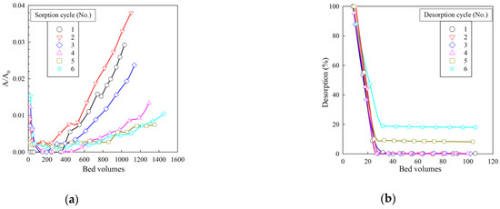 Removal of Cs-137 from model solution No. 2 under dynamic conditions. (a) Sorption output curves, (b) desorption output curves. A0—initial solution activity (Bq/mL), A—filtrate activity (Bq/mL). Bed volume is the ratio of the resin volume in the column to the fed solution volume.