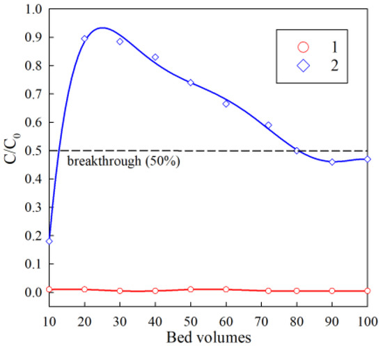 Output curves of the sorption of cesium and potassium in the experimental dilute solution. 1—cesium extraction curve; 2—potassium extraction curve; C0 is the initial concentration (mg/L), C is the concentration in the filtrate. Bed volume is the ratio of the resin volume in the column to the fed solution volume.